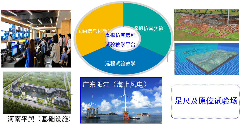 依托中山大学河南研究院和“坝道工程医院”,以“互(物)联网+足尺及原位试验场”为基础,建设“场网一体”实践育人共享平台,探索“多主体合作、多形式投入”共建模式,汇聚足尺及原位试验设施优质资源(如东北大学建设的隧道试验场,石家庄铁道大学建设的铁路实训基地,中铁装备集团和中山大学联合建设的地下工程盾构试验场等),推进科学研究和人才培养的有机融合。在河南平舆建设综合足尺试验场,第一期政府投资4亿元,占地266亩,建设路基与道面工程、建筑地基基础、建筑防水、隧道地铁与综合管廊、地下管道、水土污染防控等6个足尺试验场;二期工程占地265亩,规划建设土质堤坝、穿黄盾构、公路环道等3个足尺试验系统。