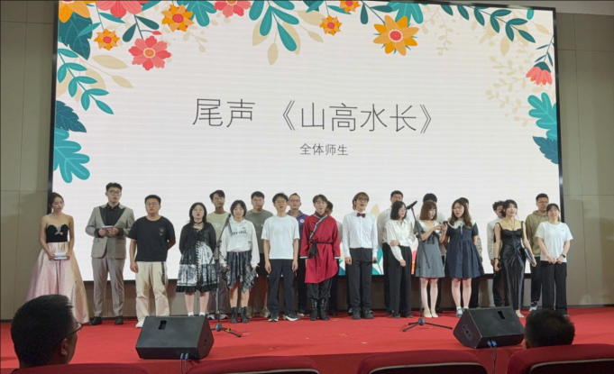全体演员上台合唱《山高水长》,精彩的晚会圆满落幕。大学岁月幸甚相知,春华秋实,夏蝉冬雪,同赴万里山河。祝学院 2025 届毕业生攀更高的山,追更暖的光,一路向阳,未来可期!
