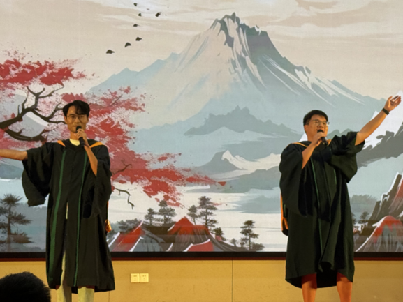 精彩节目依次上演。朱桂炫与颜熳芸同学开场合唱一曲《碧鸟红莲》,碧鸟衔来学位穗的绯红,红莲绽成毕业袍的荣光。跳动的音符里,青春在宣告永不杀青的誓言。