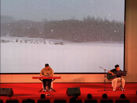 郑锐、陈柏森同学带来钢琴加吉他合奏版《圣诞快乐,劳伦斯先生》,琴声穿越时空,似乎在诉说:无论前路如何跋涉,终将向光明归航。李永翔同学以一曲《春夏秋冬》将校园四季酿成歌声,春樱落肩的温柔、夏雨敲窗的淅沥、秋叶铺径的斑驳、冬雪覆檐的静谧,都翻涌成诗。