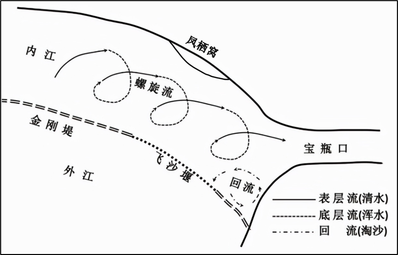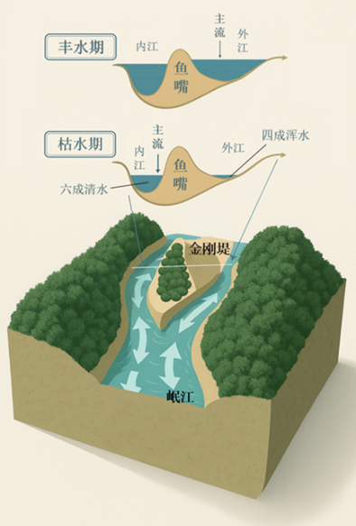 形如游鱼的堤坝将岷江一分为二。枯水期的鱼嘴发挥着精密的财务分配:表层60%的清水如银线般注入深且窄的内江河道,底层40%富含泥沙的浊流则自动转向浅且宽的外江。到了丰水期,暴涨的江水在弯道处上演着自然的魔法:借助弯道环流原理,80%的泥沙被排向位于凸岸的外江,完美实现"二八排沙"的治水奇迹。