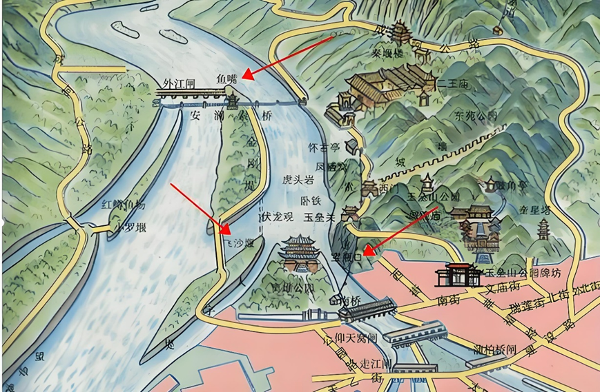 这个宽仅20米的天然水阀,藏着流体力学的终极奥秘。李冰父子通过巧妙的设计,以火烧岩石后泼水冷却,使玉垒山岩体崩裂,将玉垒山凿出合适的渐变截面。当岷江水涌入时,宝瓶口如同精密的节流阀,既能防止洪水倒灌,又能以厘米级精度调节流量。这套系统历经两千多年仍保持着±3%的稳定输水精度,远超现代普通水闸的控制水平。