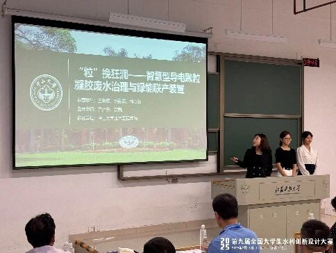 我院王琳媛、赵雨菲、林心蕊(指导教师:尹启东、贺凯)设计的《“粒”挽狂澜--智慧型导电颗粒凝胶废水治理与绿能联产装置》 表现优异,荣获大赛特等奖。该作品创新性地利用导电生物凝胶工艺,构建独特导电结构封装微生物与活性炭,显著提升废水处理效能与能源回收率,尤其在处理抗生素等新兴污染物方面效果突出,获得评委高度认可,具有创新性、合理性和实践性。