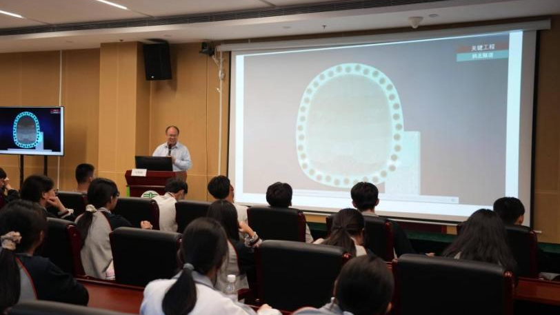 在海琴一号大楼,丰顺中学师生们聆听了我院马保松教授主讲的科普讲座《隧通八方 造福人类:重大工程与创新技术》。马教授以亲身参与的港珠澳大桥拱北隧道和天山胜利隧道两大国家重大工程为例,深入浅出地介绍了隧道建设中的技术挑战与创新突破。