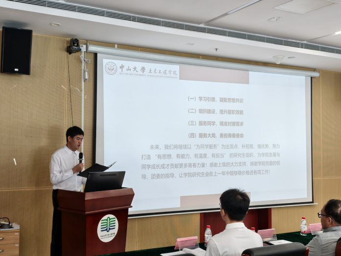 正式会议中,何思骏同学代表学院第六届研究生会向参会嘉宾和代表汇报过去一年的工作。学院研究生会始终以思想引领为魂、以组织建设为基、以同学需求为要、以大局服务为责组织开展了一系列活动,助力同学成长成才、服务学院高质量发展。